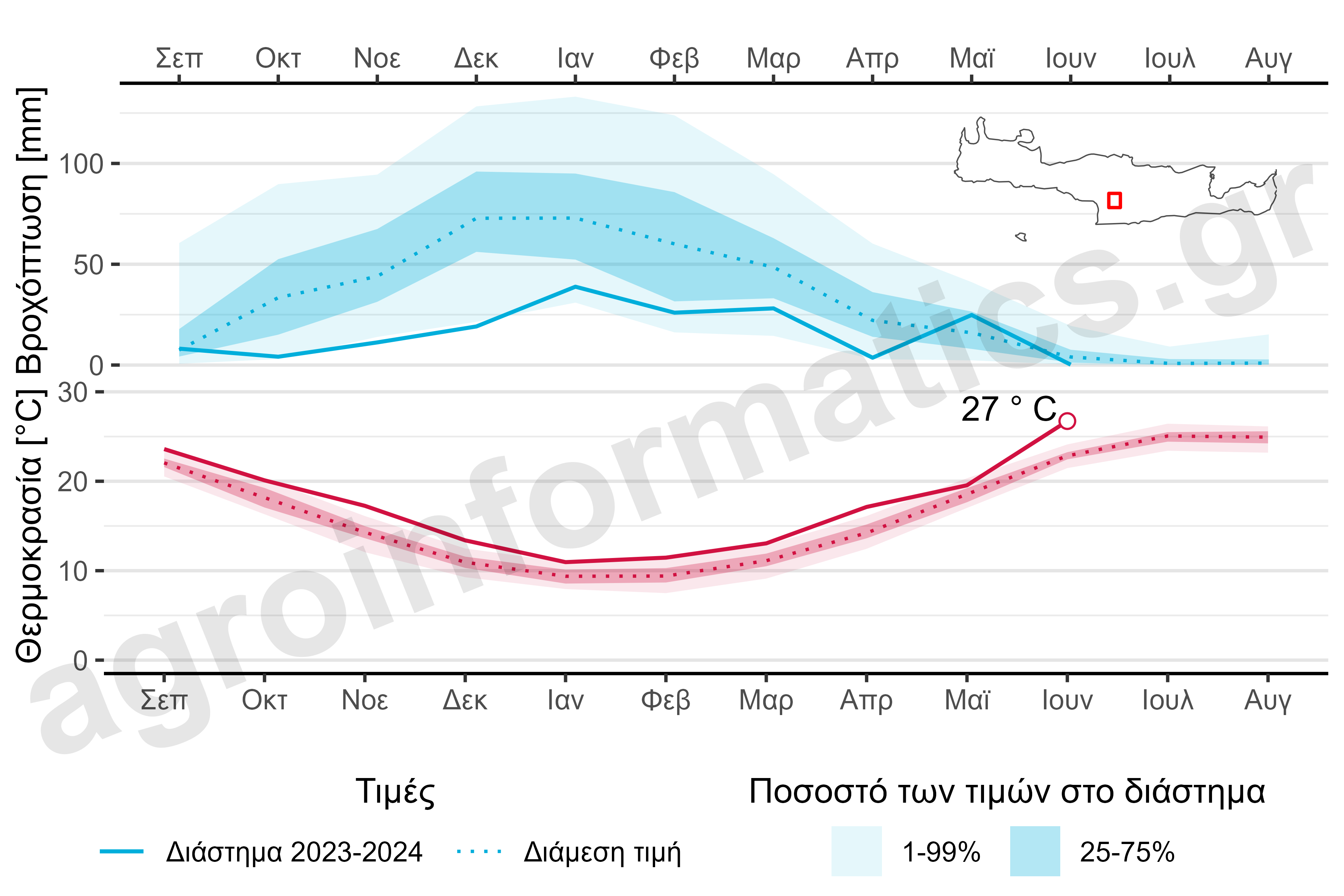 Τα τελευταία χρόνια έχουμε συνηθίσει να σπάμε τα κλιματικά ρεκόρ το ένα μετά το άλλο (Wong, 2023), αλλά τον Ιούνιο του 2024 η Κρήτη είχε την τιμητική της. Όπως φαίνεται από την Εικόνα 1, τον Ιούνιο του 2024 ο κάμπος της Μεσσαράς βρέθηκε στο ξηρότερο και θερμότερο άκρο των μετεωρολογικών δεδομένων, όπως αυτά έχουν καταγραφεί στη βάση ECMWF ERA5-Land, με τη μέση θερμοκρασία να φτάνει τους 27 °C.