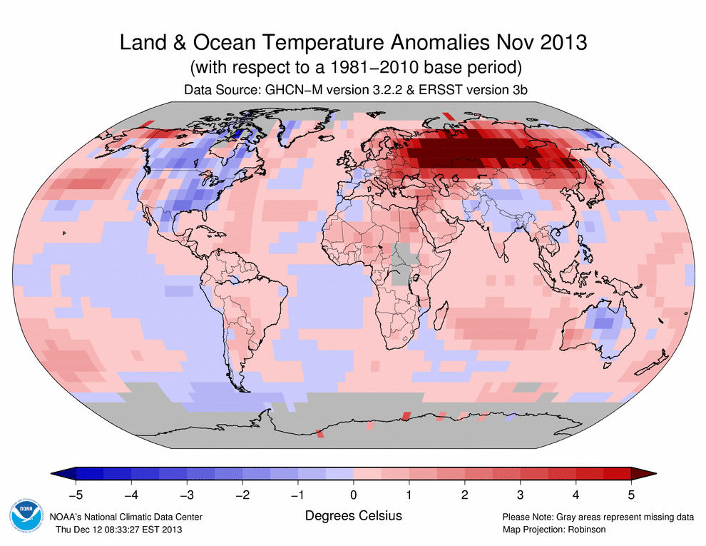 An astonishing warm spell over Russia, up to 14 degrees F above normal, helped Earth achieve its warmest November on record. Global temperatures were 1.4 degrees F above the 20th century average, 0.05 degrees F above the previous record from 2004 according to NOAA’s National Climatic Data Center.