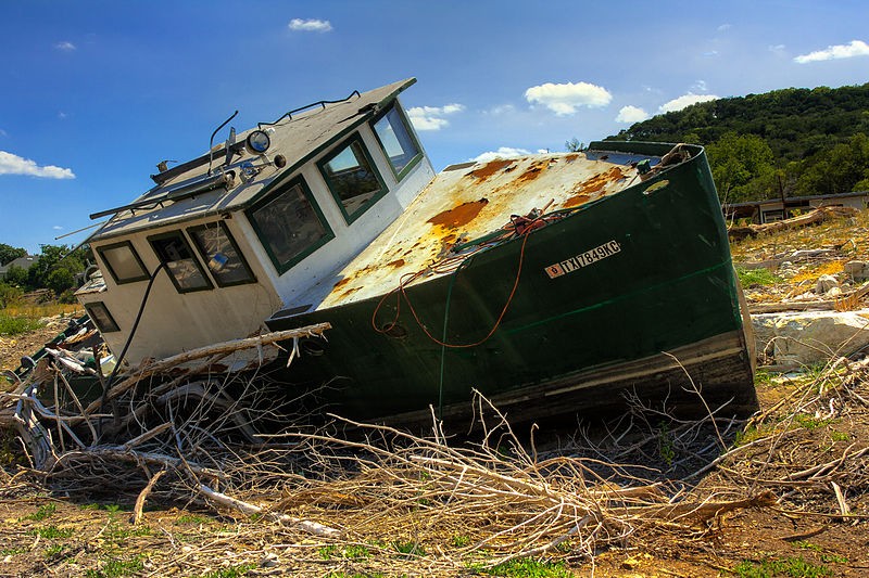 The 2011 drought dried up most of Central Texas water ways. This boat was left to sit in the middle of what is normally a branch of Lake Travis, part of the Colorado River.